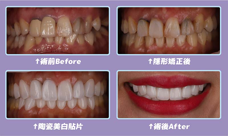 案例分享 隱形矯正 首頁 精選文章 案例分享 案例分享 隱形矯正 案例分享 隱形矯正 就診原因:牙黃、牙齒反黑、排列不整齊、牙齒形狀不滿意 治療方式:全口隱形矯正、全瓷貼片 主治醫師:王脩然醫師、沈志容醫師