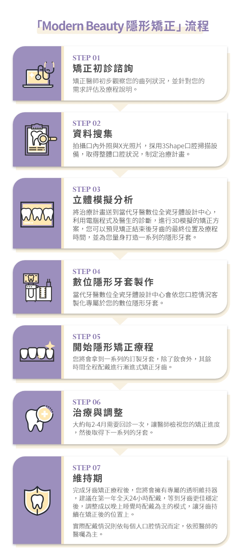 隱形矯正是利用一系列設計的透明「可摘式」數位隱形牙套,用精密的口腔掃描的方式,取得病患的牙齒狀況,進而透過隱形牙套循序漸進地把牙齒矯正至理想位置,讓飲食不再受限、輕鬆清潔的舒適選擇。矯正醫師透過先進3D電腦科技與斷層掃瞄技術,結合醫師的專業診斷,運用專業設計的設備,模擬牙齒矯正後的移動方式,讓您在矯正前了解牙齒移動的完整過程,依照每個人的不同需求,訂定個人的牙齒矯正計畫。